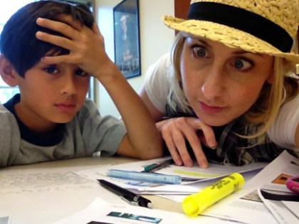 Here I am with a frustrated Boy Wonder knee-deep in 4th grade project hell at our local library